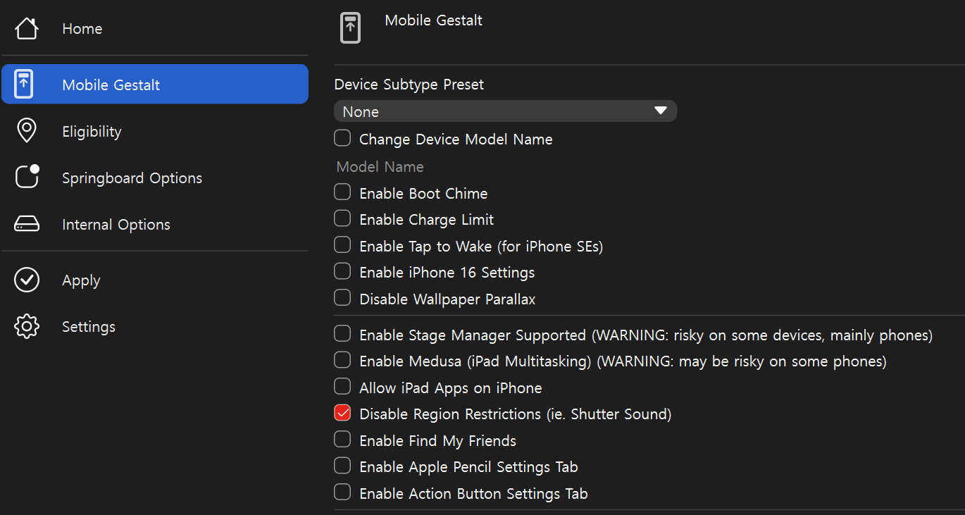 Choose Gestalt File -> 단축어로 추출한 MobileGestalt 파일 선택